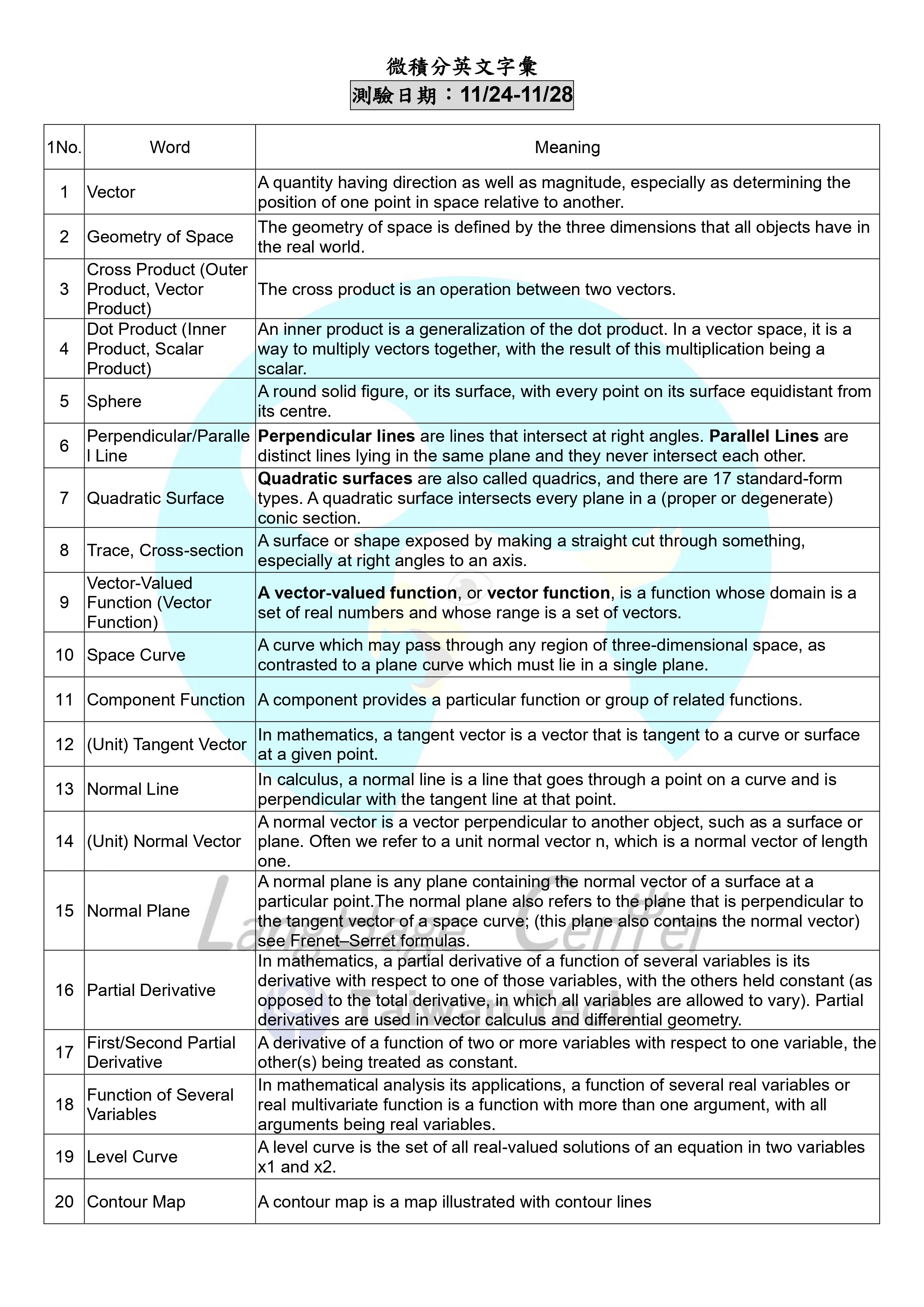 【線上微積分詞彙測驗】第九週單字表(114/11/24-114/11/28)