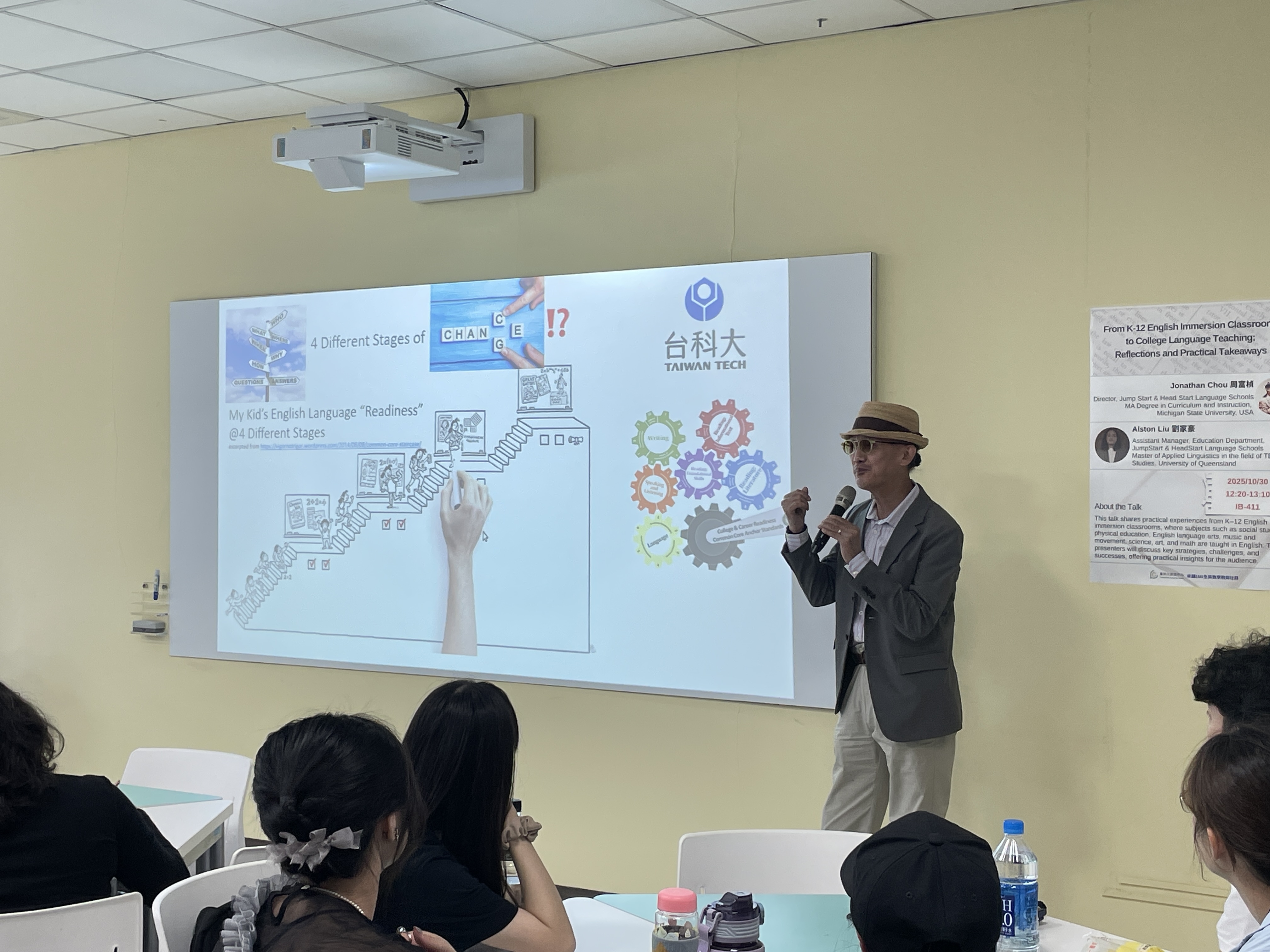 本次講者為 JumpStart 與 HeadStart Language Schools (伯克徠教育機構)教育團隊的兩位講者——周富楨協理與劉家豪副理,主題為From K-12 English Immersion Classrooms to College Language Teaching: Reflections and Practical Takeaways,分享其在英語沉浸式教學上的實務經驗。
