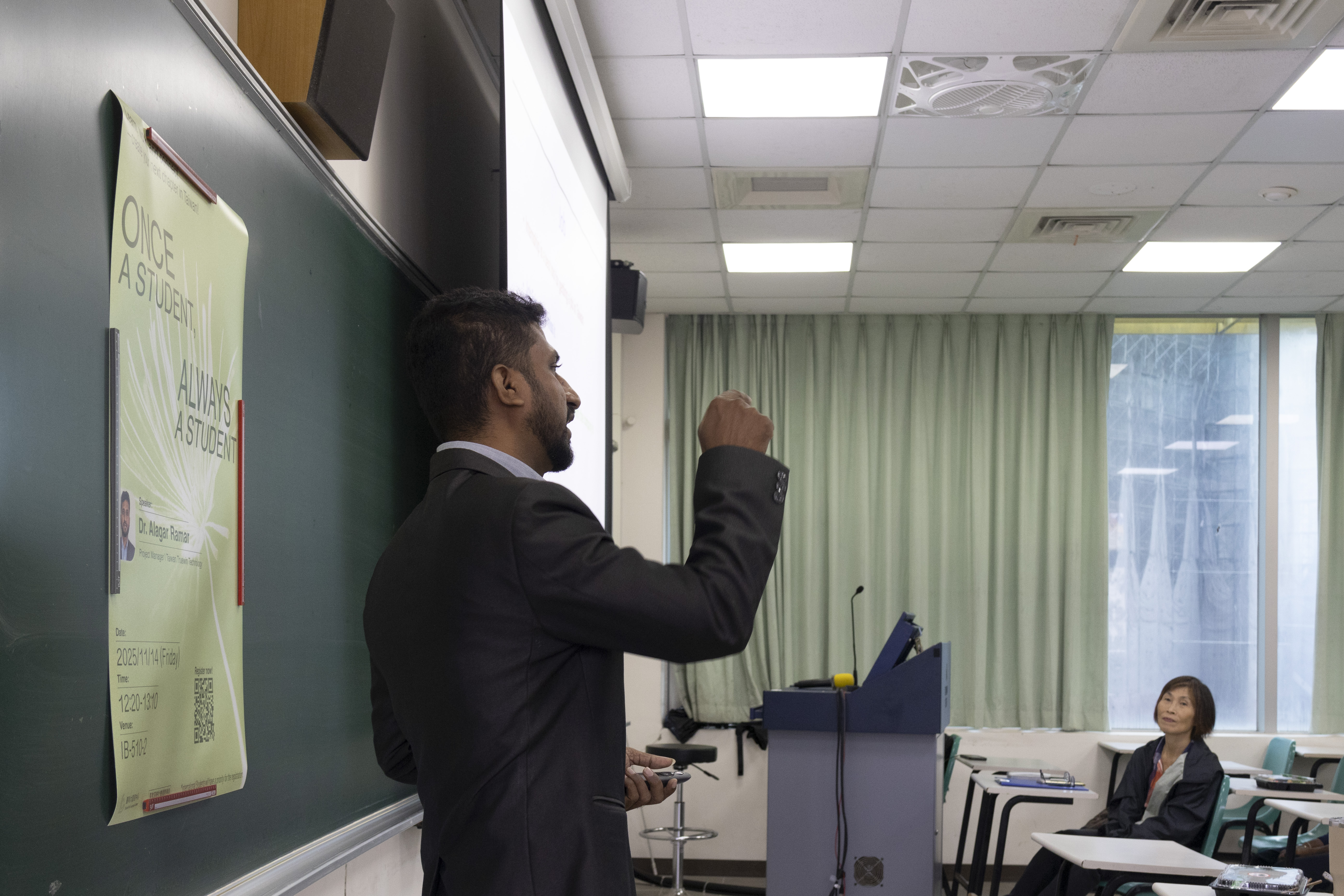 Dr. Ramar先介紹了他的經歷,其實他在博士畢業後先來到臺科任職博士後研究員近一年後,曾經先到馬來西亞工作一年,但後來再回到臺科續任博士後研究員並且工作了四年,去年時轉直到臺南的科技業公司任職專案經理。