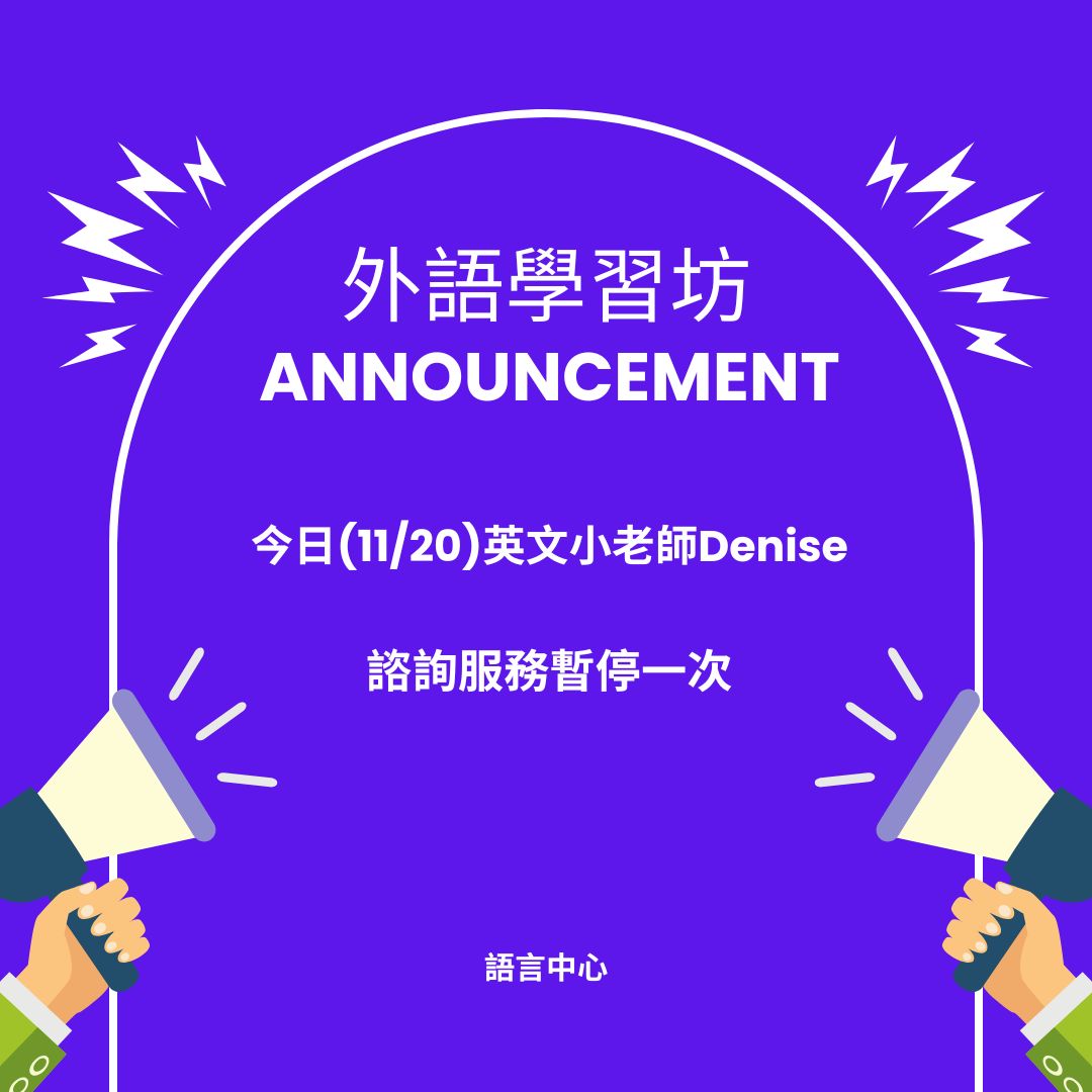 【重要通知】今日外語學習坊第四節英文小老師諮詢暫停通知