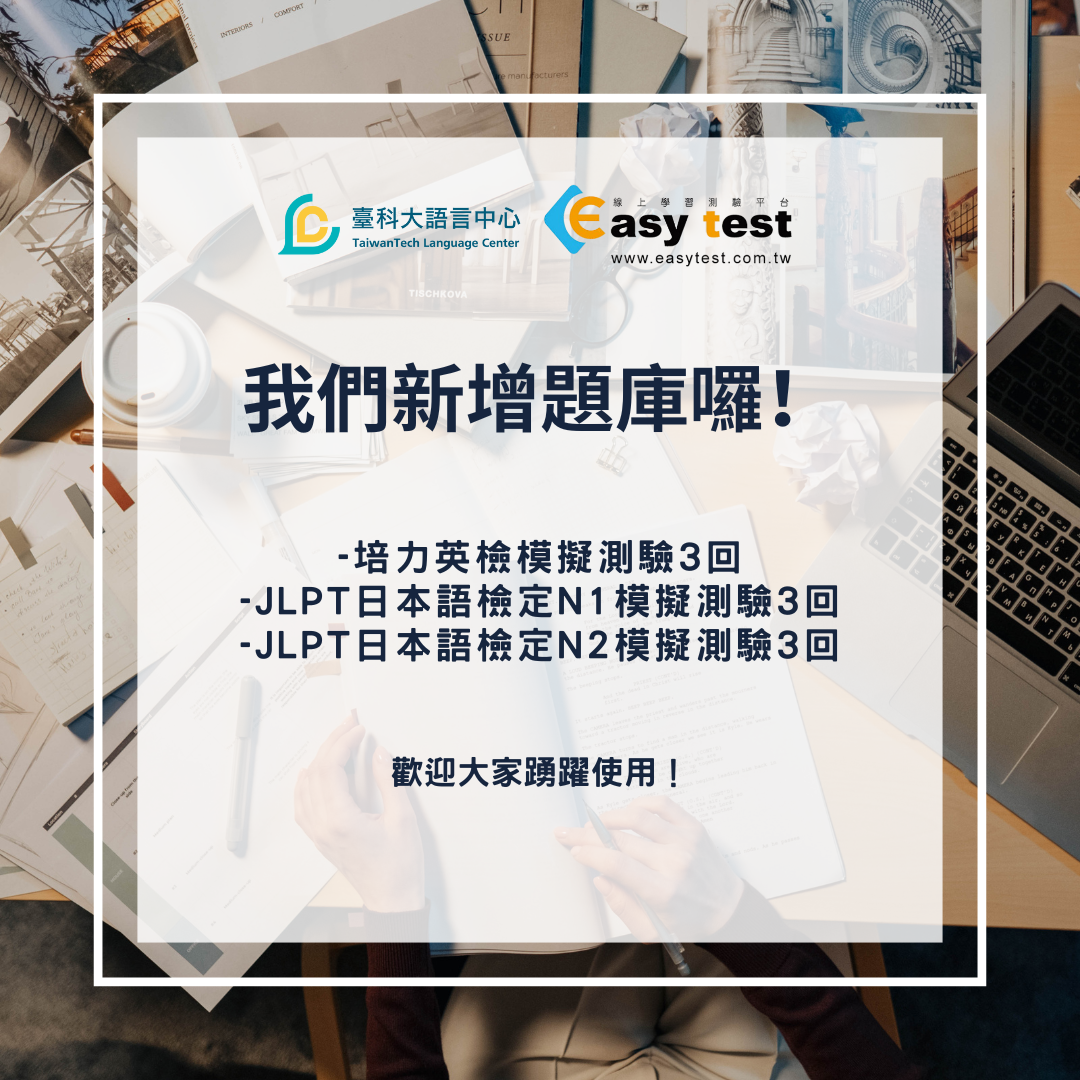 我們最近在Easy test線上學習測驗平台新增了培力與日檢的題庫囉!詳細如下: