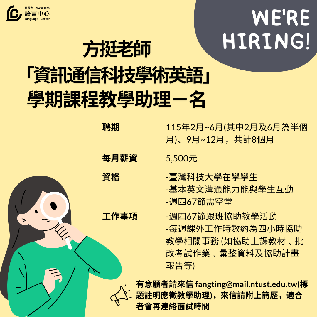 【徵人資訊】方挺老師「資訊通信科技學術英語」課程教學助理一名