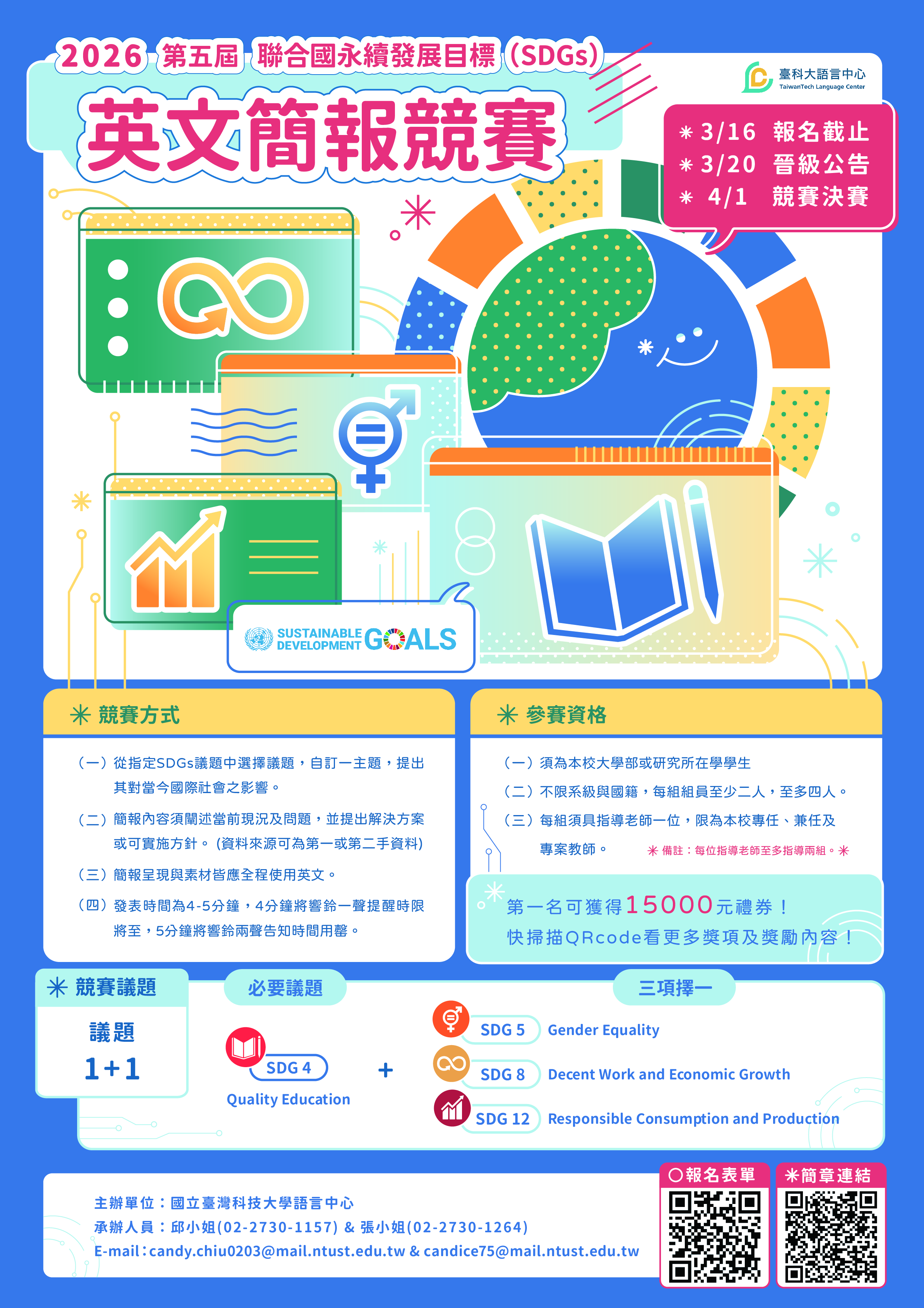 別忘了「2026第五屆臺科大聯合國永續發展目標(SDGs)英文簡報競賽」報名已經開跑啦~