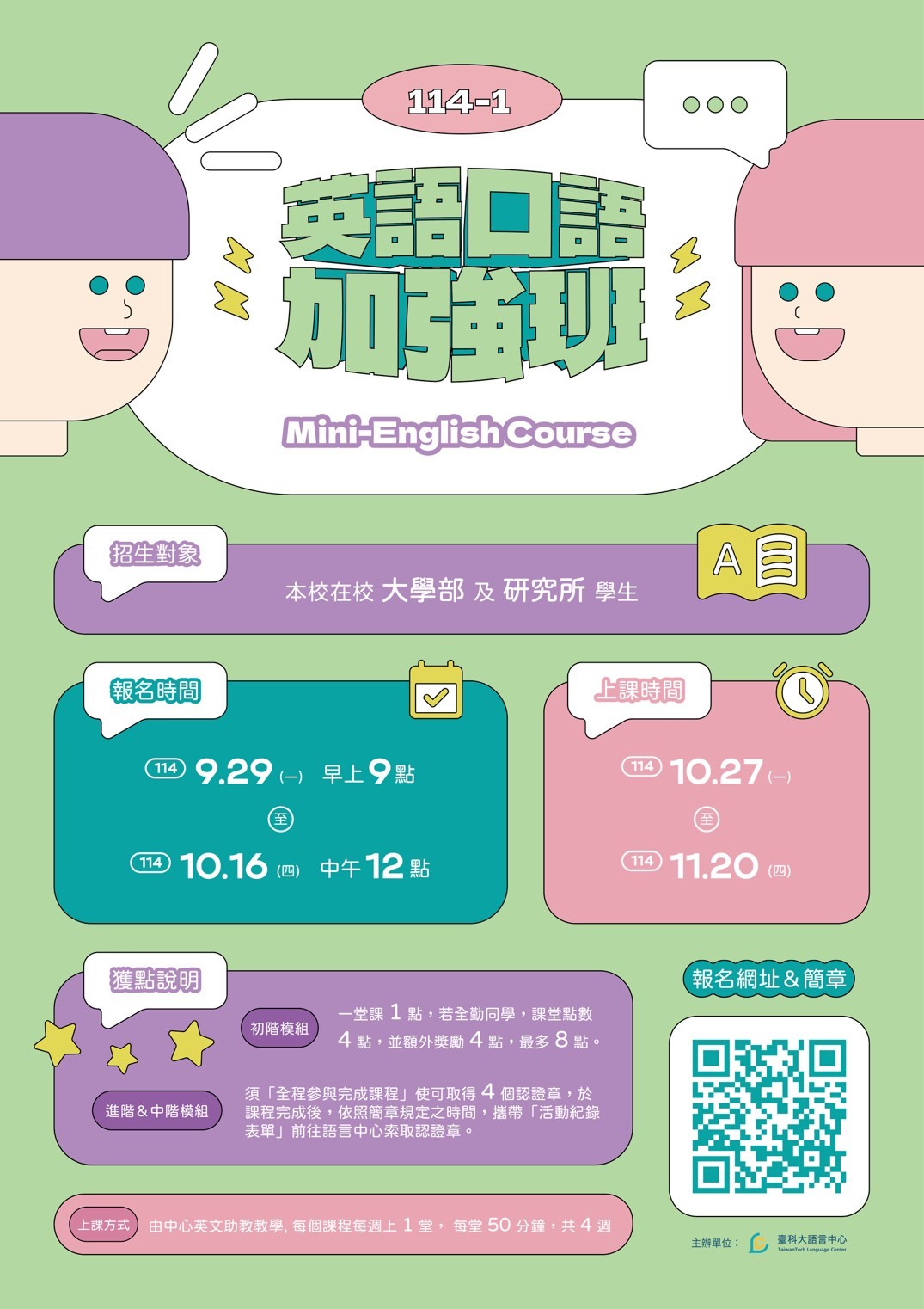 In order to advance students' English, to create a competitive advantage for their future career, and to improve their communication skills in English, the Language Center offers English Mini-course of Speaking for a month. It is expected that, with TAs' guidance, students improve their English through these courses specially designed for different levels.